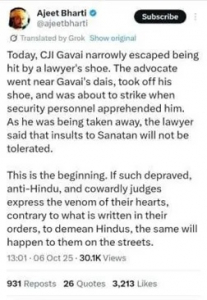 कुछ दिन बाद, जब एक वकील ने CJI पर जूता फेंका, भारती की लाइवस्ट्रीम ने इस हमले को तमाशा बना दिया। 6 अक्टूबर के दूसरे वीडियो में उन्होंने कहा, “अगर न्यायाधीश ऐसे हिंदू- विरोधी बयान देना जारी रखते हैं, तो जो आज कोर्ट में हुआ वह कल सड़कों पर भी हो सकता है।”