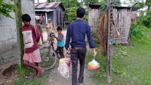 Parbati Das welcomes with a smile Nanda Ghosh who is bringing rations