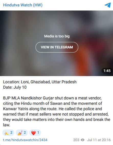 - 10 जुलाई को उत्तर प्रदेश के गाजियाबाद के लोनी में, भाजपा विधायक नंदकिशोर गुर्जर ने सावन के महीने और रास्ते में कांवड़ यात्रियों की आवाजाही का हवाला देते हुए एक मांस विक्रेता की दुकान बंद करवा दी।