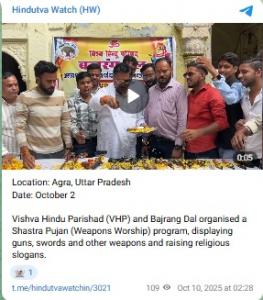 2 अक्टूबर को उत्तर प्रदेश के आगरा में, VHP-बजरंग दल के एक कार्यक्रम में “बंदूकें, तलवारें और दूसरे हथियार दिखाए गए।”