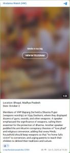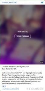 2 अक्टूबर को मध्य प्रदेश के भोपाल में, विजय दशमी पर VHP-बजरंग दल के एक कार्यक्रम में हिस्सा लेने वालों ने “दर्जनों बंदूकें, तलवारें और दूसरे हथियार” प्रदर्शित किए।