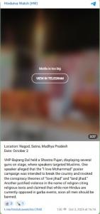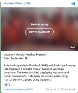 2 अक्टूबर को नागौद, सतना (मध्य प्रदेश) में, VHP-बजरंग दल के एक कार्यक्रम में “स्टेज पर कई बंदूकें” थीं, जबकि वक्ताओं ने मुसलमानों को निशाना बनाया।