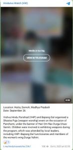 26 सितंबर को, हटा, दमोह (मध्य प्रदेश) में, VHP-बजरंग दल-दुर्गा वाहिनी के एक कार्यक्रम में “बच्चों को हथियार दिखाने में शामिल किया गया”।