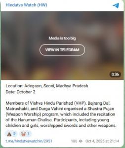 2 अक्टूबर को, अदेगांव, सिवनी (मध्य प्रदेश) में, “छोटे बच्चों और लड़कियों” को तलवारों की पूजा करते हुए रिपोर्ट किया गया।