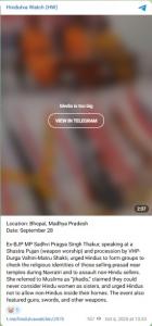 28 सितंबर को, भोपाल में एक अन्य कार्यक्रम में, जिसमें पूर्व सांसद साध्वी प्रज्ञा ठाकुर भी थीं, उनके भड़काऊ भाषण के बैकग्राउंड में “बंदूकें, तलवारें और दूसरे हथियार भी” दिखाए गए।