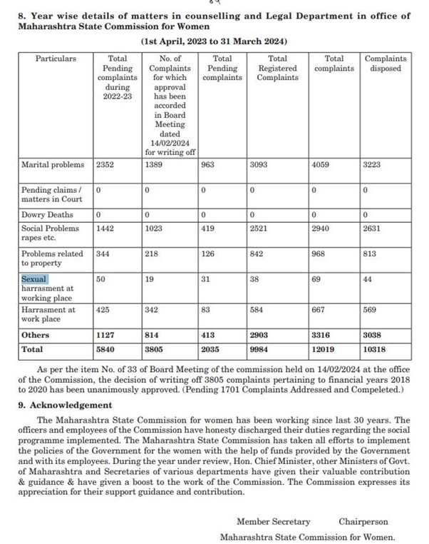 2023–24 के लिए महाराष्ट्र राज्य महिला आयोग के आंकड़े यह समझने के लिए एक अहम संदर्भ देते हैं कि काम की जगह से जुड़ी शिकायतें आम तौर पर कैसे दर्ज और निपटाई जाती हैं। साल भर में निपटाई गई कुल 12,019 शिकायतों में से, ज्यादातर शिकायतें वैवाहिक विवादों (4059 मामले) और बड़े सामाजिक मुद्दों, जिनमें बलात्कार (2940 मामले) भी शामिल है, से जुड़ी थीं। इसकी तुलना में, काम की जगह पर यौन उत्पीड़न के तौर पर खास तौर पर वर्गीकृत शिकायतों की संख्या सिर्फ 69 थी, जिनमें से 44 शिकायतें उसी दौरान निपटा दी गईं। इससे पता चलता है कि भले ही ऐसे मामले गंभीर हों, लेकिन कुल शिकायतों के परिदृश्य में इनका हिस्सा काफी कम है।